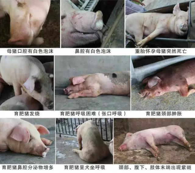 (3)豬肺疫(鎖喉風、腫脖瘟)口鼻有白色泡沫、有的留濃鼻子、犬坐、呼吸高度困難、頸部皮膚紅腫,觸摸有疼痛感、尖叫。皮膚上可見淤血性血斑。豬肺疫死亡鼻子流出白色泡沫,個別帶血。剖檢肺臟水腫、氣腫、頜下皮膚有膠凍樣浸潤。治療首選恩諾沙星、氟苯尼考。